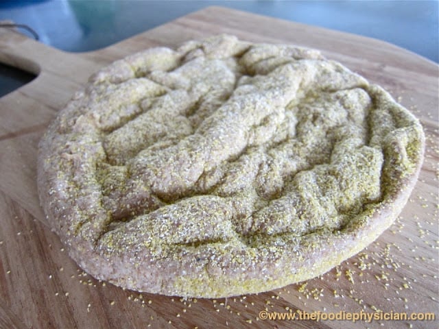 I like to make my own pizza dough when I have the time. But sometimes I take a shortcut and use a ball of pizza dough from from my local pizzeria or the grocery store. Most pizzerias will gladly sell you some of their dough but you can also use refrigerated or frozen pizza dough from the grocery store. To make the recipe more nutritious and incorporate some whole grains, I use whole-wheat pizza dough. Whole grains have high amounts of fiber, vitamins, minerals and antioxidants. It's recommended in the USDA Dietary Guidelines that at least half of the grains we consume should be whole grains.