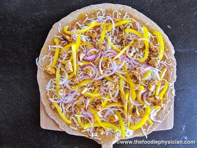 Instead of tomato sauce, I spread sweet mango chutney on the pizza dough. Then I top it with pieces of spicy Tandoori chicken. To add color and texture, I also sprinkle on some mozzarella cheese and sliced yellow bell pepper and red onion. For a final burst of flavor, drizzle on a homemade cilantro yogurt sauce when the pizza comes out of the oven. The cooling, tangy yogurt sauce nicely balances out the sweetness of the mango chutney and spiciness of the chicken.
