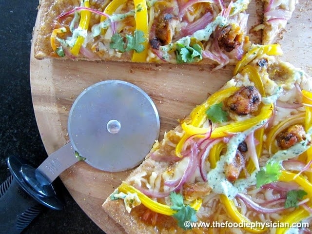 My Tandoori Chicken Pizza has a nice mix of sweet and savory Indian flavors that put a unique twist on classic pizza. I layer spiced chicken, sweet mango chutney, and colorful veggies on whole wheat pizza dough and finish it off with a cooling cilantro yogurt sauce.