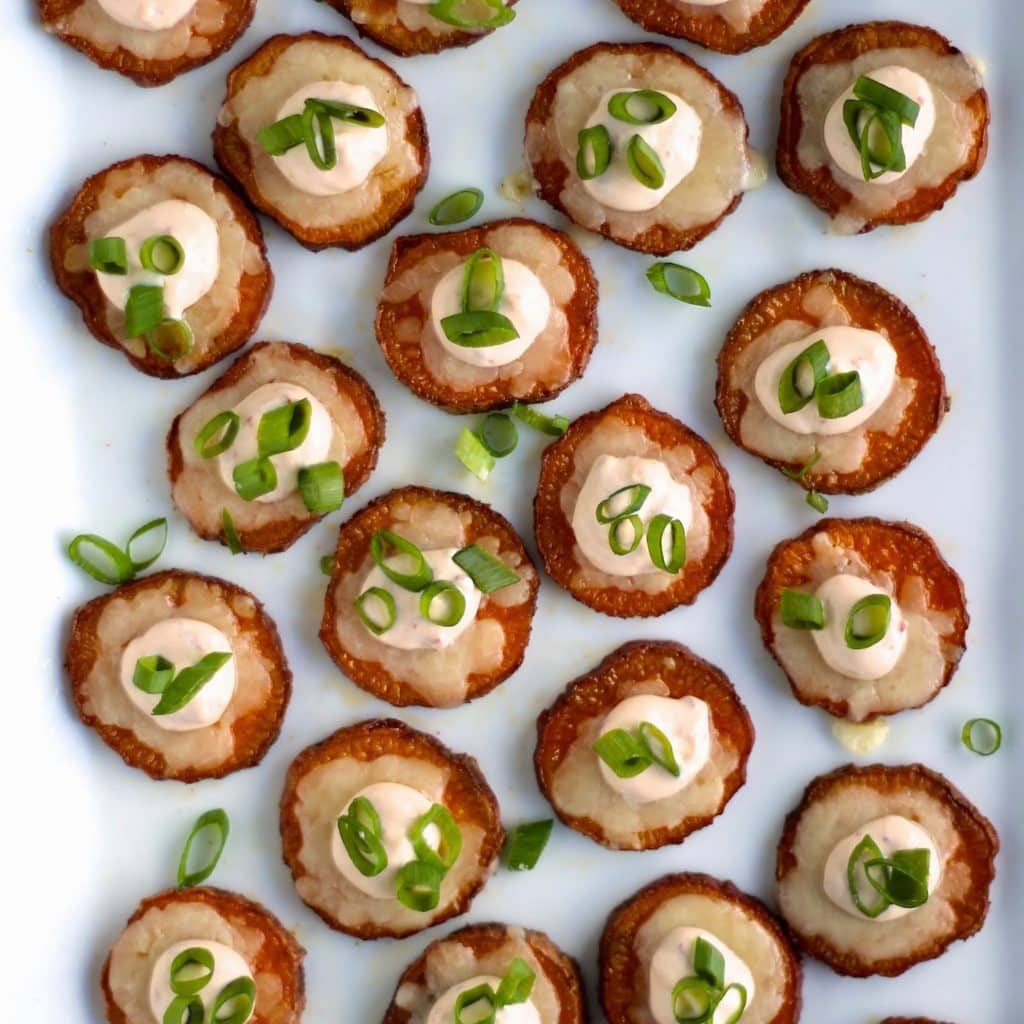 - Arrange the sweet potato coins on a serving platter. Top each with a dollop of chipotle crema. Garnish with scallions.