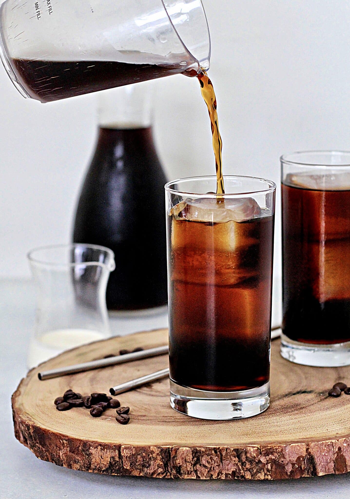 You want to make sure to use coarsely ground coffee as it will yield the best product with minimal cloudiness. After the coffee has soaked, it's time to strain it. You can use a fine mesh strainer or make one by lining a strainer with a coffee filter or cheesecloth. The finer the strainer, the less sediment you will have, which means a cleaner flavor. I use a cloth coffee sock filter that's made just for straining coffee that I actually found at my local grocery store (you can also buy them online). If you have a French press, you can also use that. Just put the coffee and water in it at night and let it steep overnight. In the morning, plunge and you're ready to go.