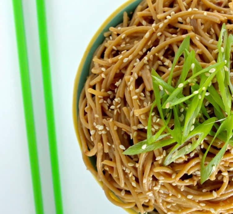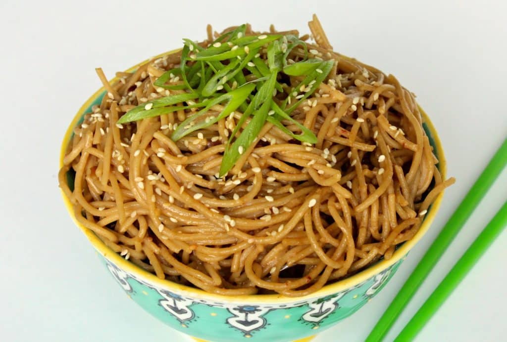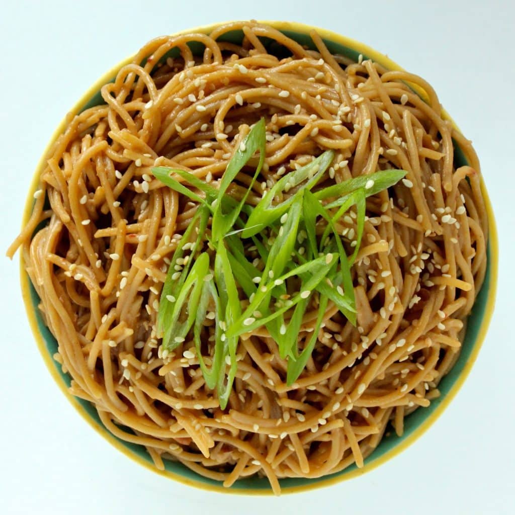 - Pour the sauce over the spaghetti and toss to combine. Garnish with sesame seeds and scallions. The noodles can be served warm or cold.