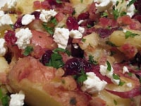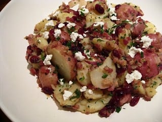 This dish is my take on a German potato salad which is usually served warm with a slightly tart bacon and vinegar dressing. In this version, I use crispy pancetta instead of bacon. And because I love the play of sweet and salty flavors, I also toss in some dried cranberries which nicely complement the saltiness of the pancetta. I also like to crumble fresh goat cheese on top- I think it adds a nice tangy flavor and creaminess that works great with the warm potatoes. These potatoes also make a nice side dish during the holidays.