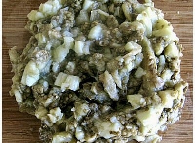 When the eggplant is done, remove it from the oven and let it cool. Then, peel off the skin and chop up the eggplant flesh.
