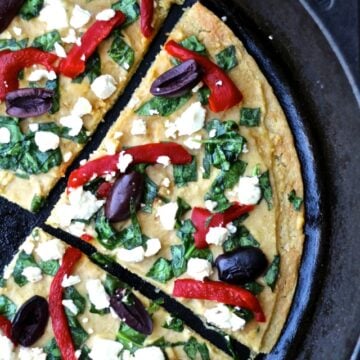 My Mediterranean Socca Pizza is cooked in the oven until golden brown and crispy and then topped with delicious Mediterranean ingredients. Instead of tomato sauce, I spread a layer of Sabra Roasted Garlic Hummus on the crust and then top it with fresh, flavorful ingredients- baby spinach, roasted red peppers, kalamata olives and feta cheese- yum! Of course, you can use whatever ingredients you like but this combination was perfect! Cut it into slices or rough wedges and serve. It can be made ahead and reheated or served at room temperature. Pick it up with your hands, no utensils necessary. It's the perfect game day dish for feeding a crowd.