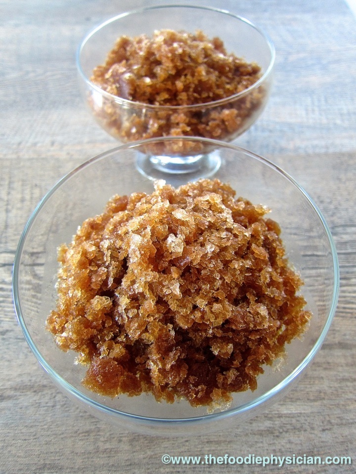 The liquid is poured into a dish and placed in the freezer. Then every 30 minutes or so, the mixture is scraped with a fork to break up the ice crystals and create a texture similar to shaved ice.