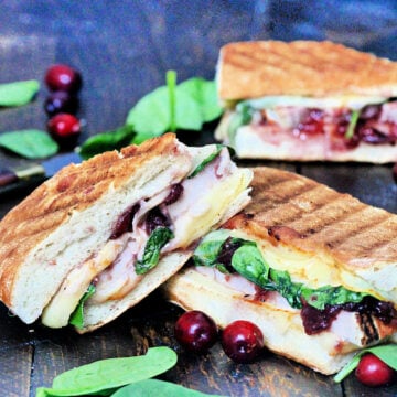 These Turkey and Cranberry Panini are one of my favorite post-holiday dishes. They're the perfect vehicle to use up some of those yummy Thanksgiving leftovers. And if you don't have leftover roast turkey, no worries! You can make this tasty sandwich with deli turkey or rotisserie chicken too.