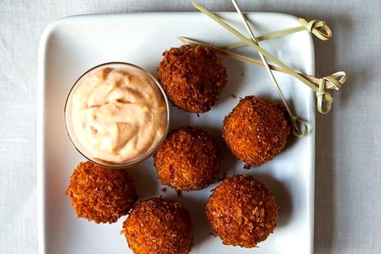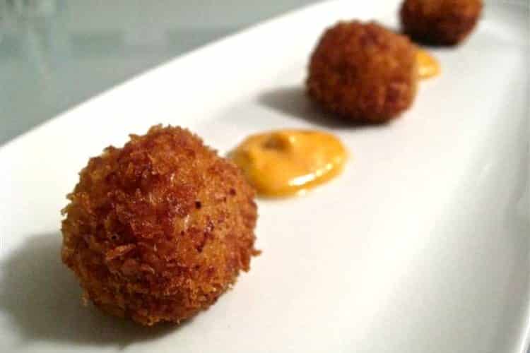 My version of Spanish croquetas uses classic Spanish flavors including Serrano ham and Manchego cheese. And to dip the crispy bites into, I make an easy aioli using Pimenton de la Vera, a delicious Spanish smoked paprika which gives the aioli a lovely color.