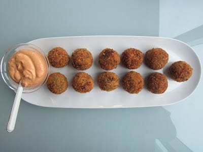 My recipe for Serrano Ham and Manchego Croquetas with Smoked Pimenton Aioli was inspired by the wonderful trip to Spain that my husband Pete and I took last year for our anniversary. We ate our way around the country and tasted a countless number of tapas, the typical small plates or snacks found in Spanish cuisine. Although we loved all of the food, our favorite indulgence was the croqueta- a Spanish croquette filled with a delicious creamy filling and served with a garlicky dipping sauce on the side.
