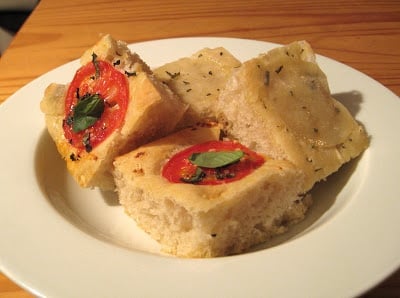 Traditional focaccia just has olive oil, fresh herbs like rosemary, and coarse salt sprinkled on top. But the toppings you can use are limited only by your imagination- try it with sliced vegetables, cheese, caramelized onions or anything else you can think of.