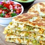 Heat a large skillet over medium heat and spray with olive oil. Place one quesadilla in the skillet and cook 3-4 minutes until toasted and golden brown. Flip the quesadilla and cover the pan. Cook another 3-4 minutes until naan is toasted and cheese is melted. Repeat with the remaining quesadilla. Cut the quesadillas into 8 wedges each. Serve with salsa, diced avocado, and Greek yogurt or sour cream.