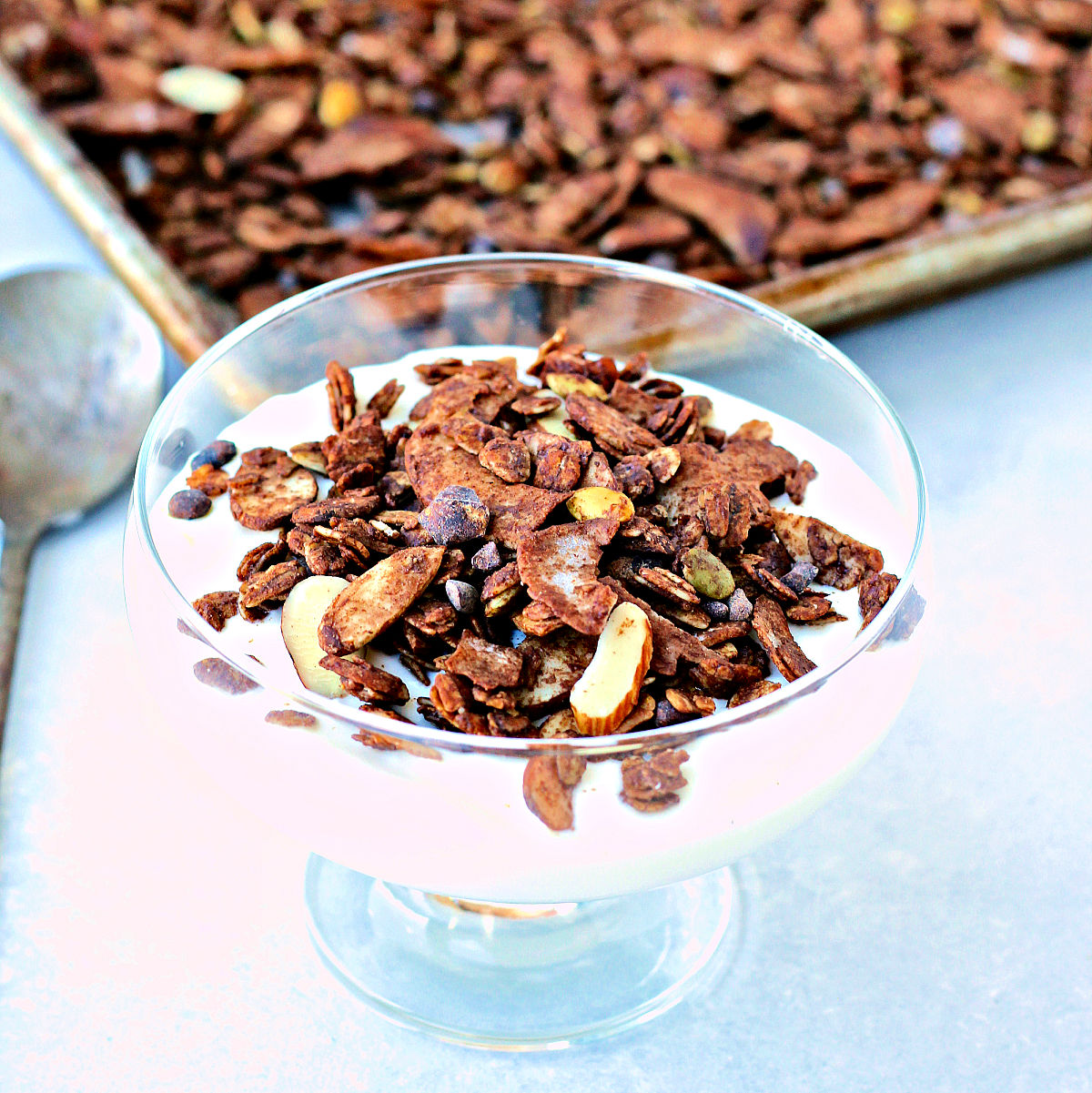 baking sheet. Bake in the oven 10-12 minutes, then stir the granola and bake another 10 minutes. Remove the baking sheet from the oven and cool (granola will crisp up as it cools). Once cool, stir in the cacao nibs.