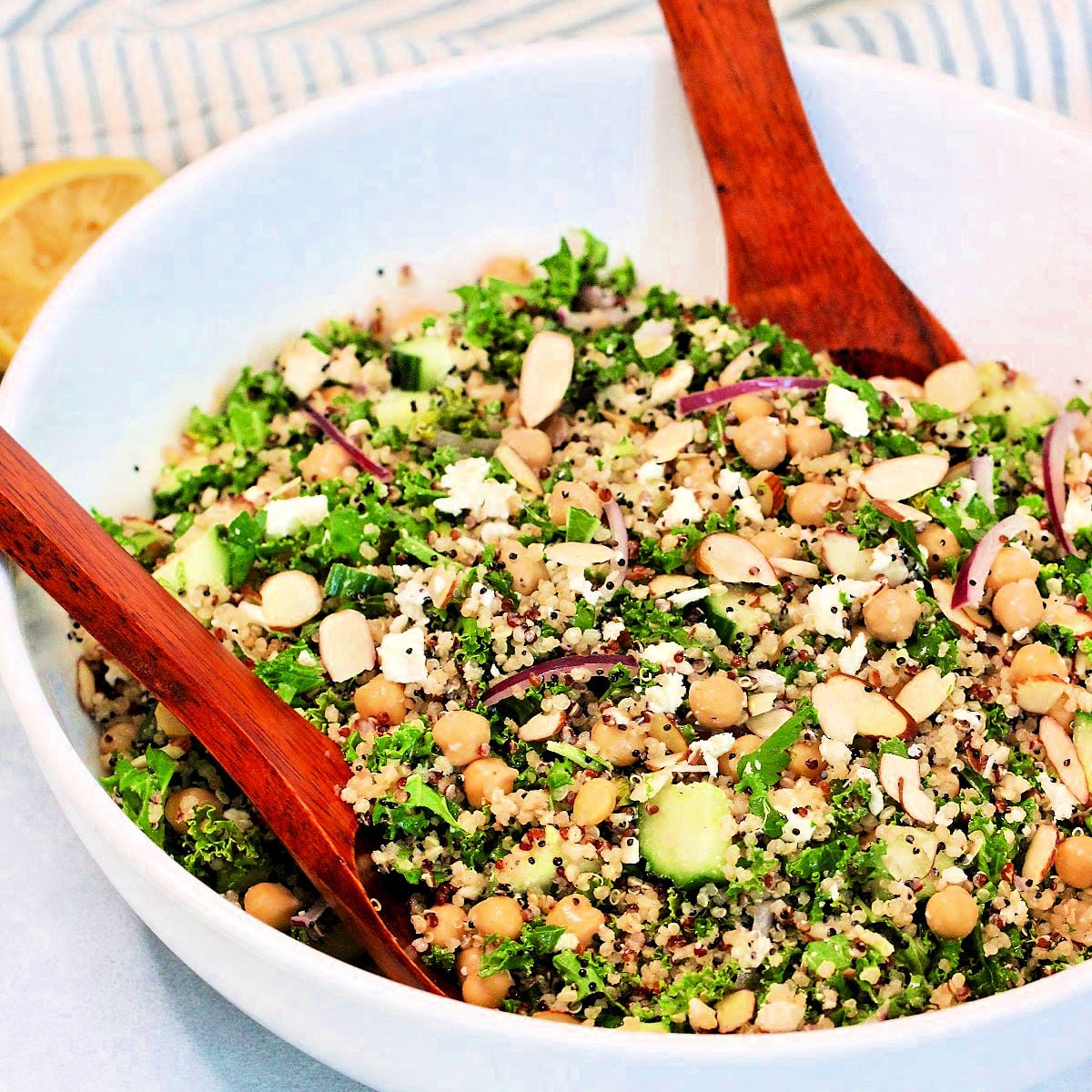 This colorful and hearty salad features whole grain quinoa, crisp kale, chickpeas, cucumber, savory feta cheese, and crunchy almonds all tied together with a bright lemon dressing.