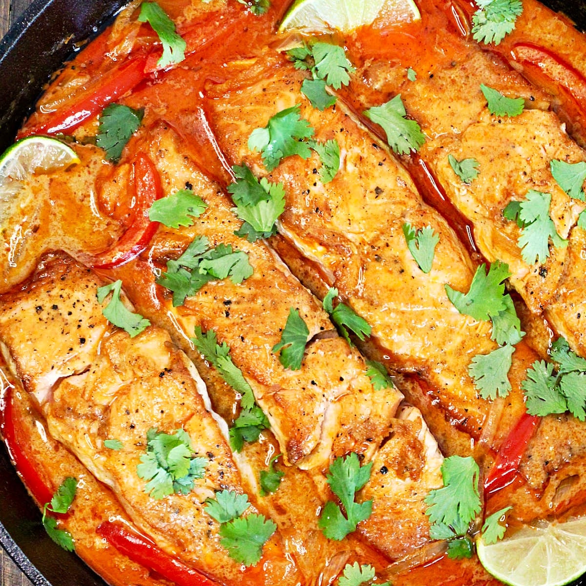 This mouthwatering Thai Salmon Curry combines tender salmon and colorful veggies with a creamy coconut curry sauce. It's a delicious one-skillet dish that can be made in 30 minutes!