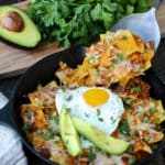 Serve the chilaquiles with a fried egg on top and garnish with cilantro. Serve with avocado slices and Mexican crema or Greek yogurt, if desired.