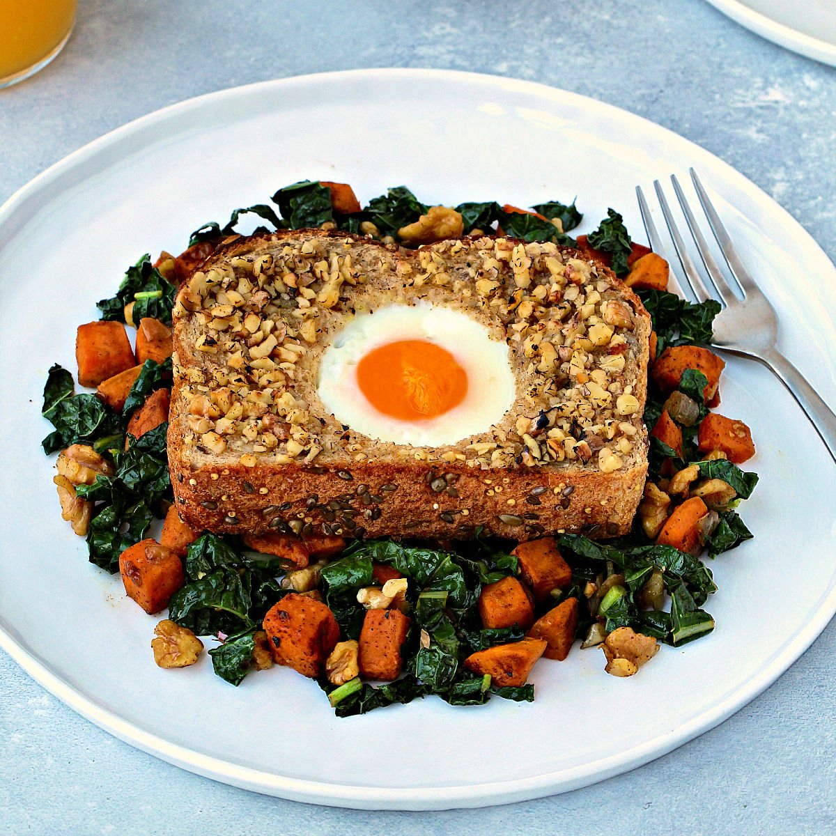 Walnut-Crusted Toad in a Hole and Sweet Potato & Kale Hash